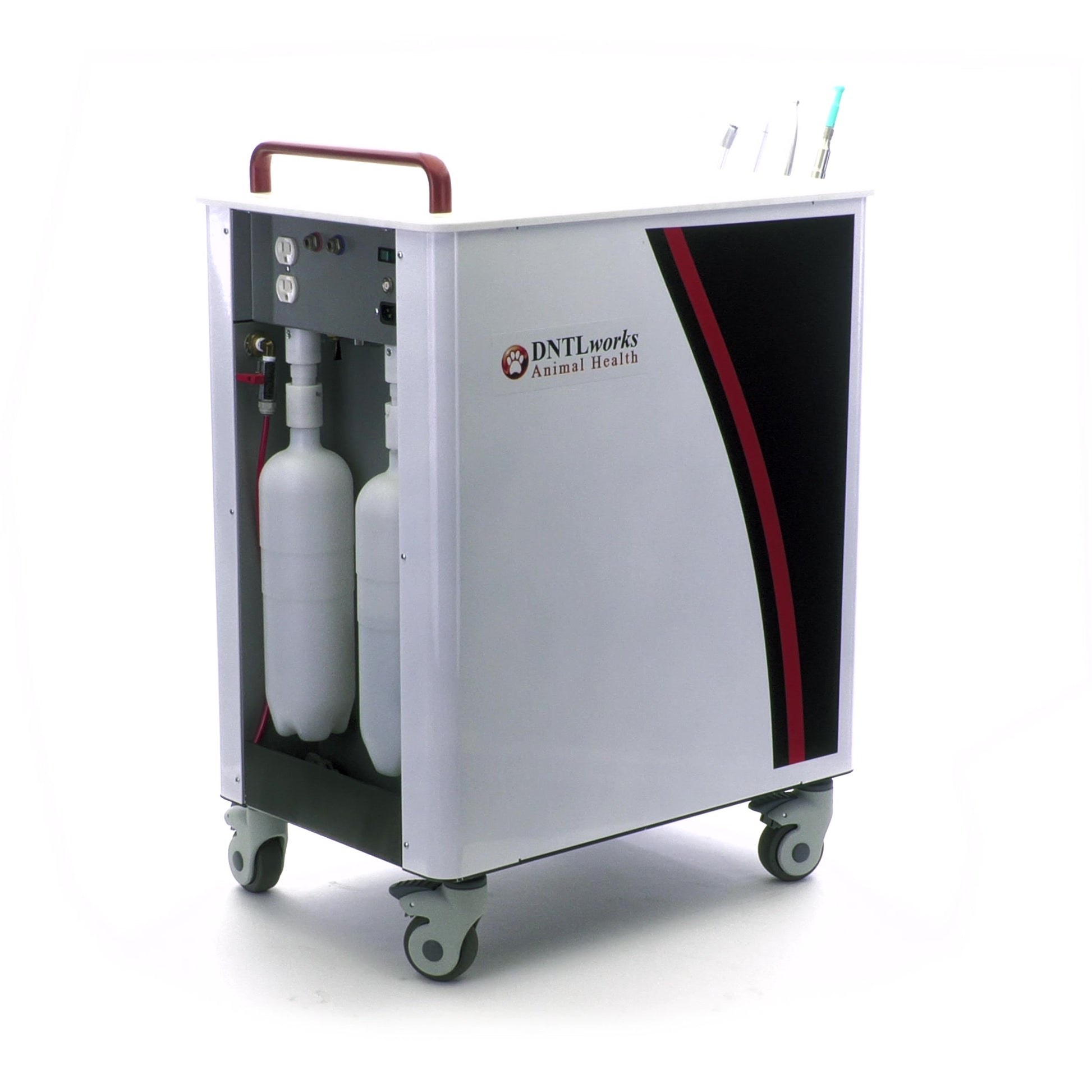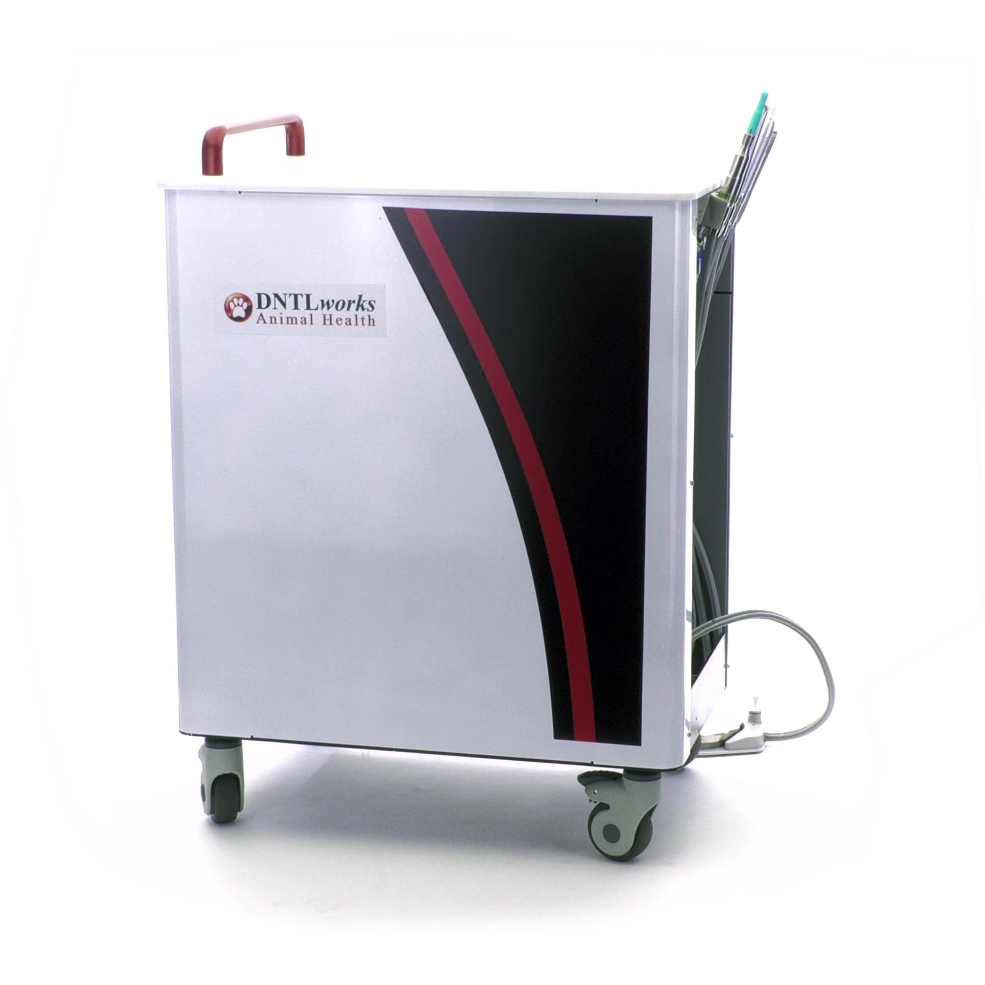 This dental treatment console serves as a comprehensive and powerful dental delivery unit designed for performing dental procedures on small animals. It includes essential components such as a quiet compressor, water system, dental handpieces, a three-way air/water syringe, and a Piezo electric scaler. The unit is versatile and suitable for a wide range of dental procedures required for small animals.