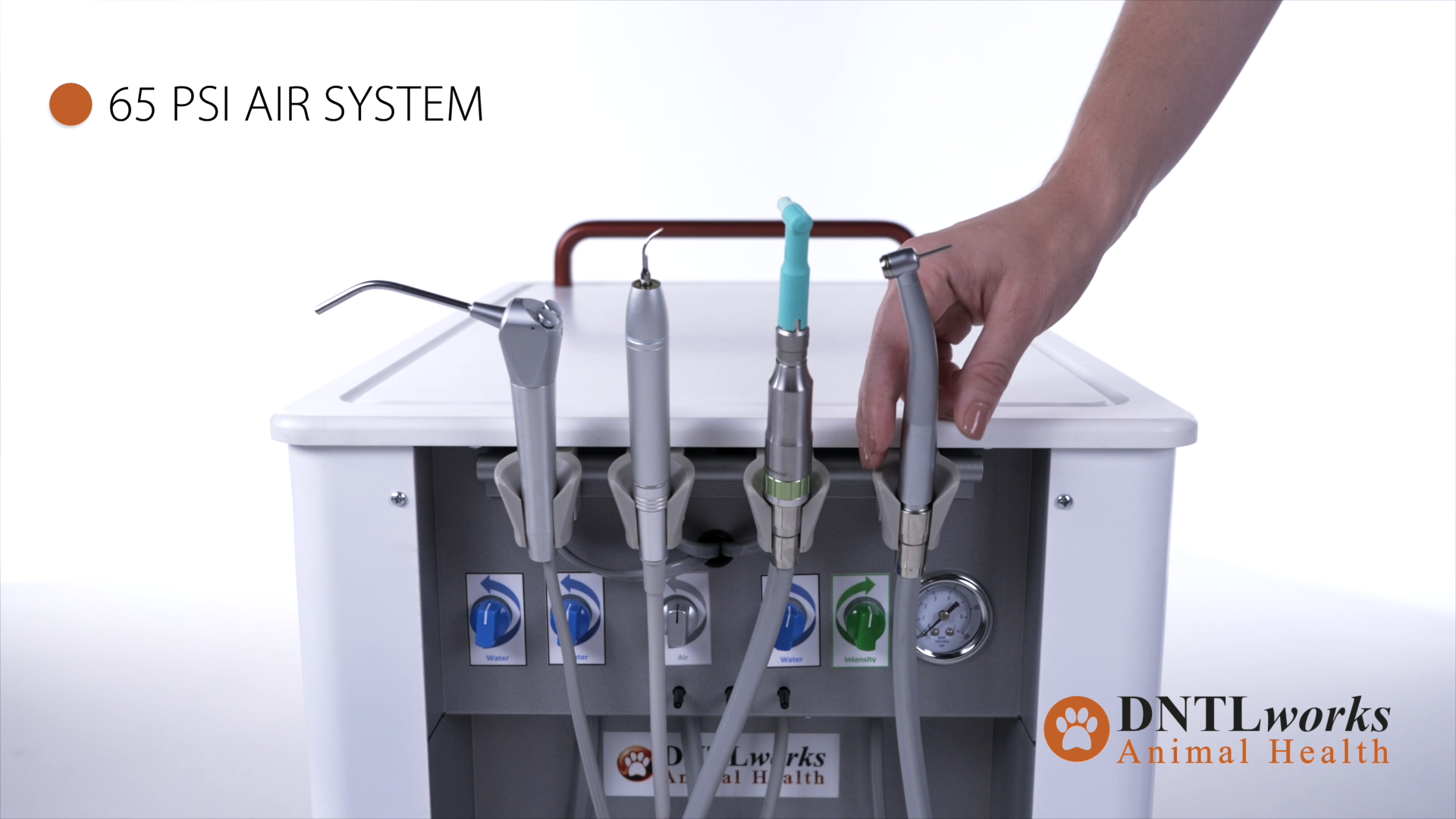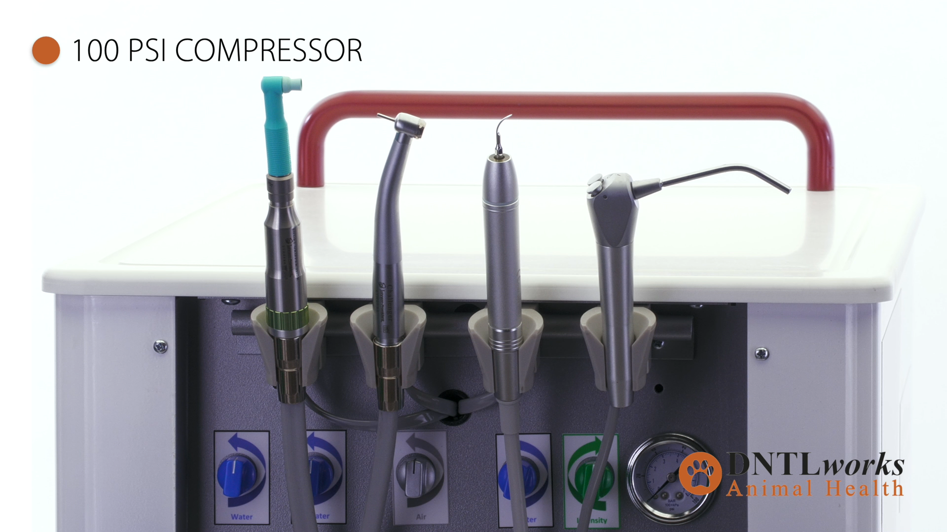 Quiet Oil-Free Compressor: The unit features a quiet (46dB) oil-free compressor that provides clean air and operates with minimal noise. This feature creates a calm and stress-free environment for both the operator and the animals during dental procedures.